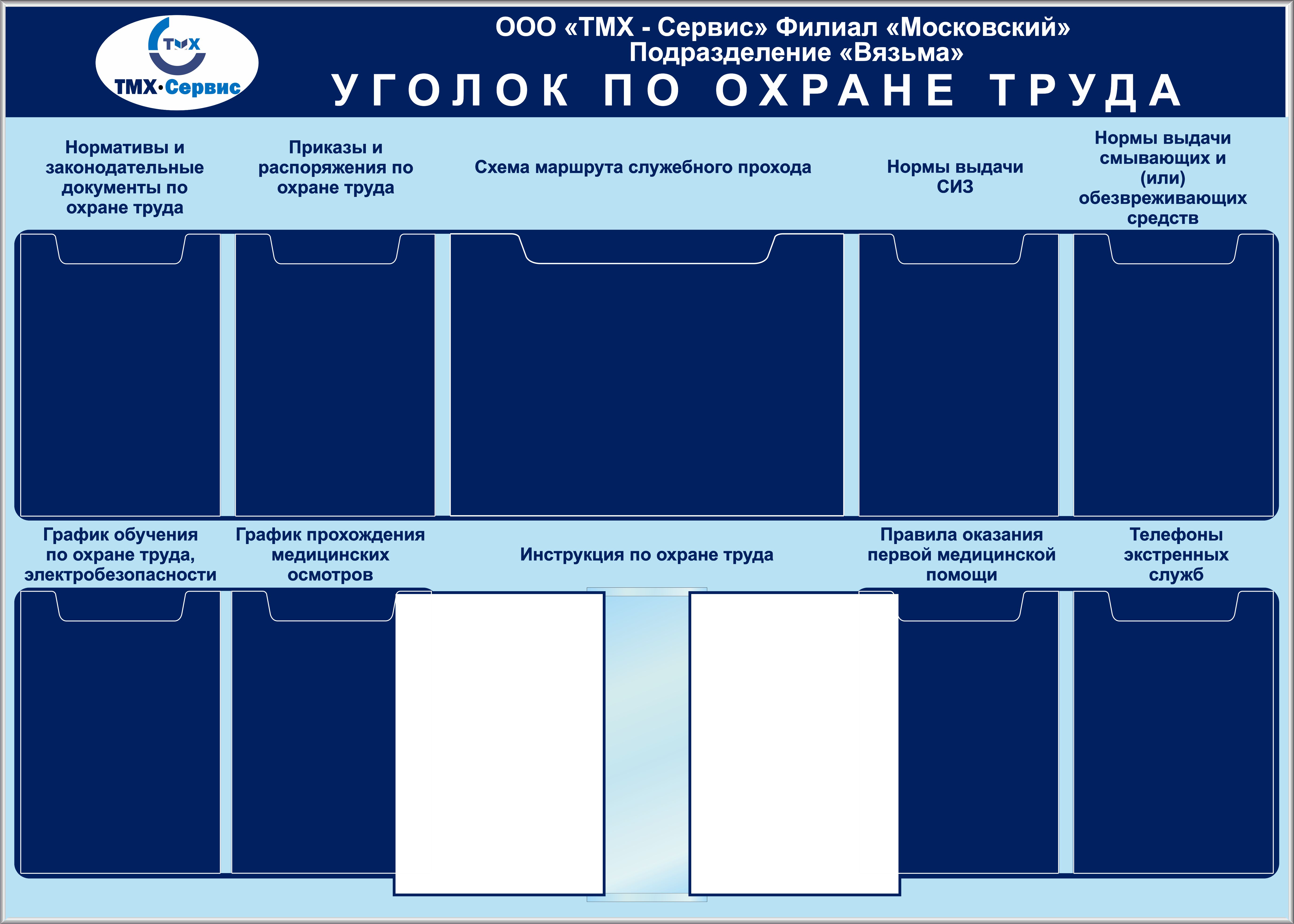 Стенд Уголок охраны труда (А3-1шт(плоский), А4-4шт (объемные), А4-6шт (плоские), Логотип (1400х950; Пластик ПВХ 4 мм, алюминиевый профиль;)